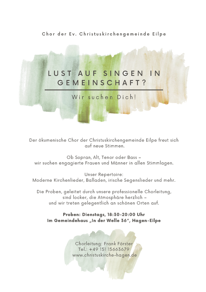 Der ökumenische Chor der Christuskirchengemeinde Eilpe freut sich auf neue Stimmen. Ob Sopran, Alt, Tenor oder Bass – wir suchen engagierte Frauen und Männer in allen Stimmlagen.